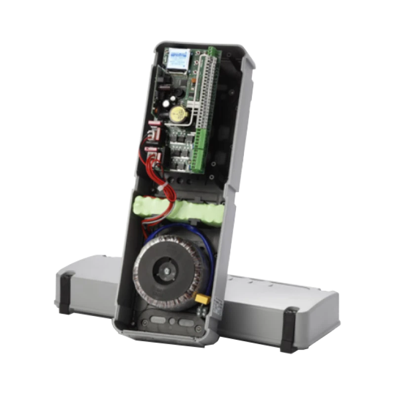 CC242EXTOPCB CARDIN Centrale de commande pour le contrôle des moteurs de portail coulissant ou battant en 24V avec encodeur. Elle comprend un décodeur radio pour fréquence en 433 MHz et un programmateur digital avec un écran LCD pour le côté pratique et simple d’utilisation. Par ailleurs, dans ce modèle sont intégrés une batterie NiMH et son chargeur pour assurer le fonctionnement de l’ensemble de l’instaltion en cas de coupure électrique.