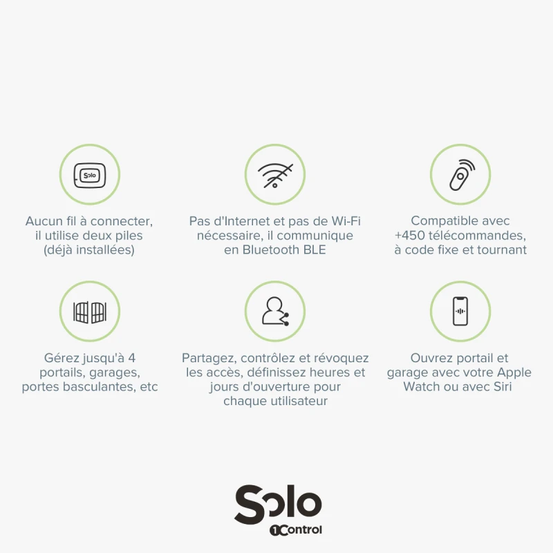 Il suffit alors de connecter les téléphones, tablettes ou autres montres connectées des utilisateurs au récepteur SOLO EVO grâce au Bluetooth pour leur permettre d’ouvrir et de fermer le portail ou porte de garage depuis l’appli 1CONTROL. Vous pouvez autoriser jusqu’à 50 utilisateurs de base en même temps avec votre SOLO EVO. Mais si vous avez besoin de plus d’accès, vous avez possibilité d’en ajouter moyennant un supplément.