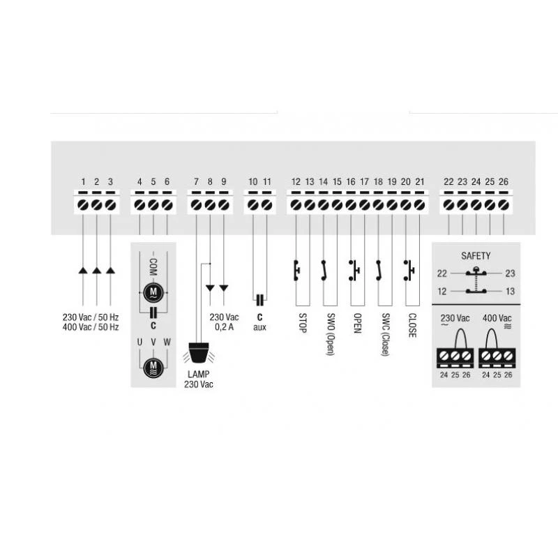 -Alimentation moteurs : 230 Vac monophasé ou 400 Vac triphasé