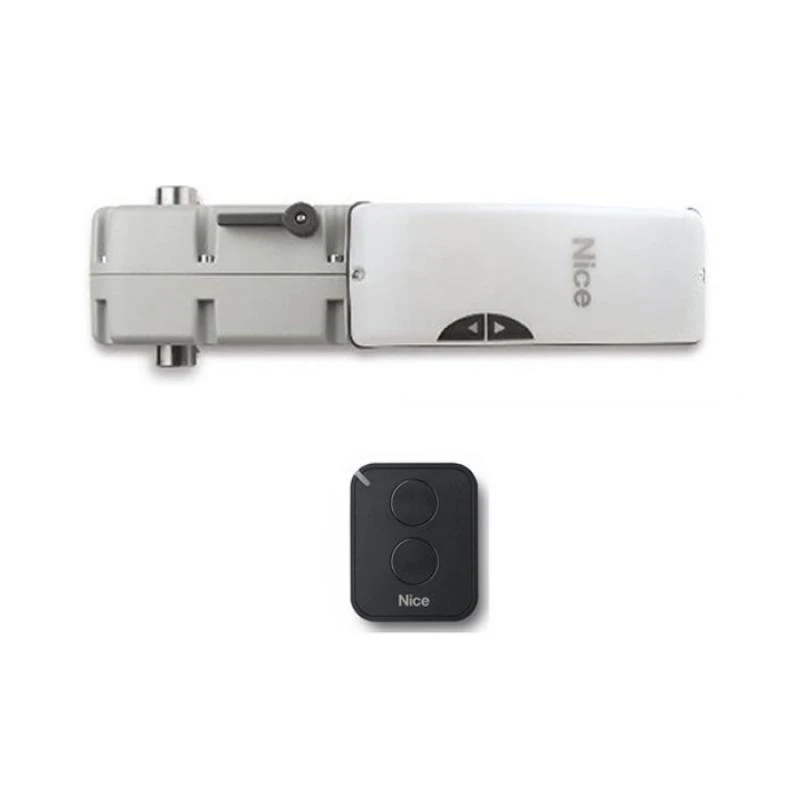 TENKIT NICE Kit motorisation pour portes de garage bascuntes (débordantes ou non) jusqu’à 9 m² maximum. Ce kit comprend un moteur électromécanique irréversible 24V avec logique de commande et récepteur incorporés, écirage automatique et fin de course électromécanique, avec une paire de bras téléscopiques standards et une paire de dispositif de renvoi. La carte radio incorporée offre possibilité de mémoriser jusqu’à 150 émetteurs. L’opérateur est doté d’un niveau de sécurité maximale grâce à un système de détection d’obstacles, il permet aussi une programmation automatique des temps de travail et est prévu pour connexion des bords sensibles de dernière génération 8,2 KOhm.